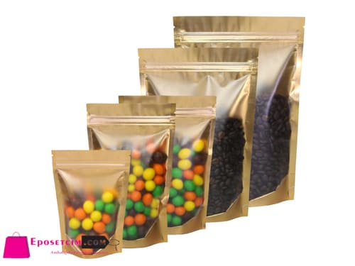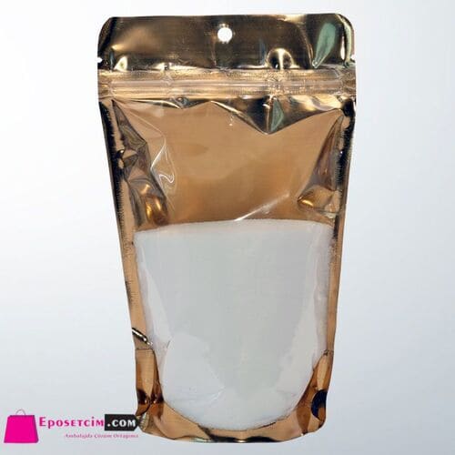 Gold Şeffaf Metalize Kilitli Doypack Poşet ürünlerimizin ön yüzü şeffaf ve arka yüzü sarı metalizedir.